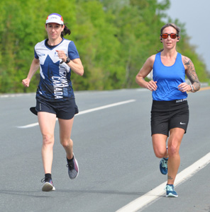 | Meghan Duffy, on the left running in Miramichi's June 5 Miler [Photo by: Norma MacLean] | Meghan running in this year's September Cross Country run in Miramichi. [Photo by: Norma MacLean] | Brian Richard (R) presenting Meghan Duffy with RunNB's Up and Coming Female Runner of the Year. [Photo by: Brian Richard] |