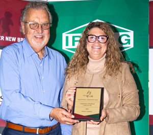 | Photo above: The 47st Fredericton Marathon of Fredericton, NB is the 2025 Event of the Year | Photo above: Donald Wade, RunNB Chairperson presents Christine Little, Race Director of the 2025 Event of the Year award. (Photo by Sofie Gautreau) |